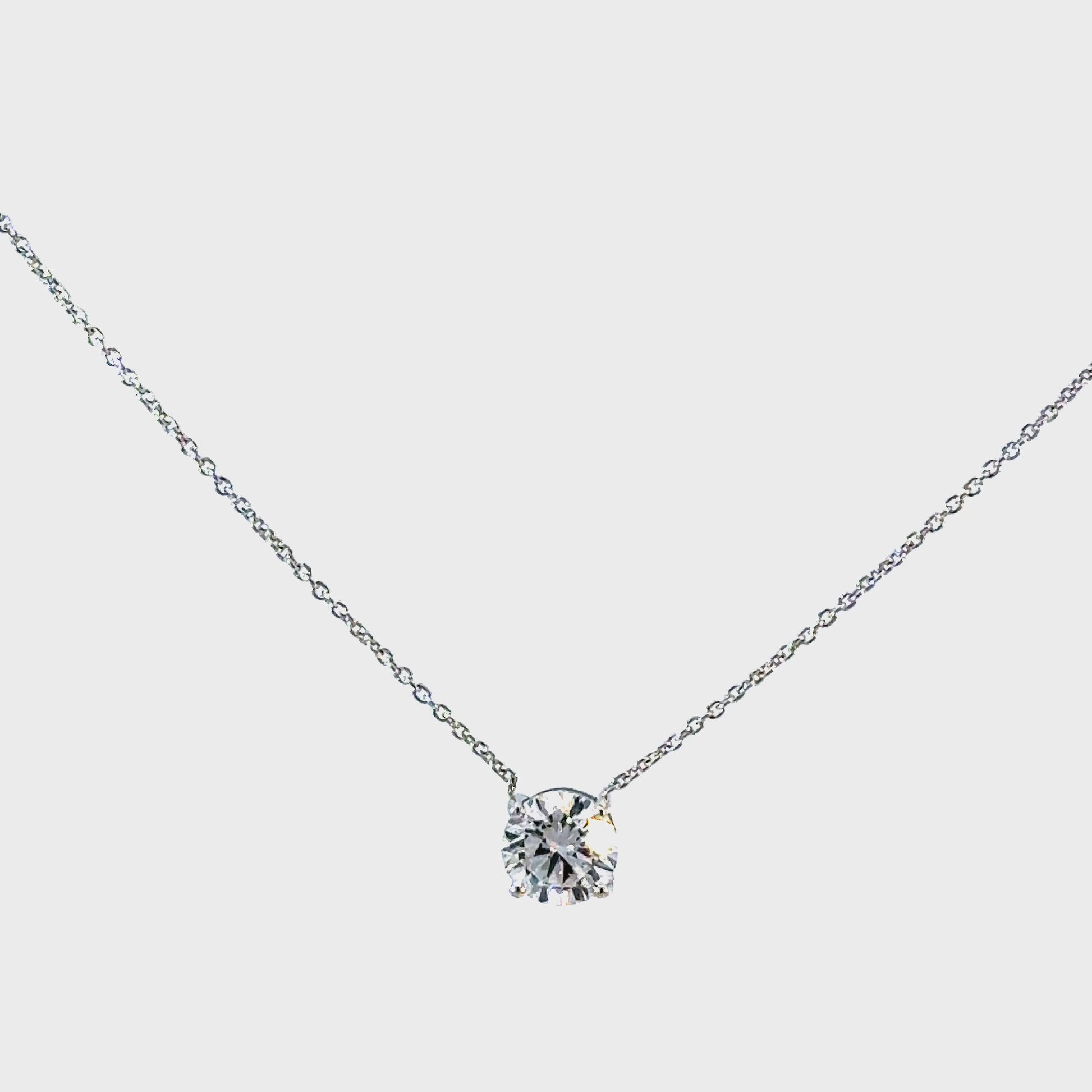 This elegant 1.50 carat lab-grown diamond solitaire necklace is crafted in polished 14K white gold, featuring a brilliant round diamond suspended from a delicate chain for a timeless, minimalist look.