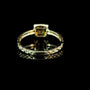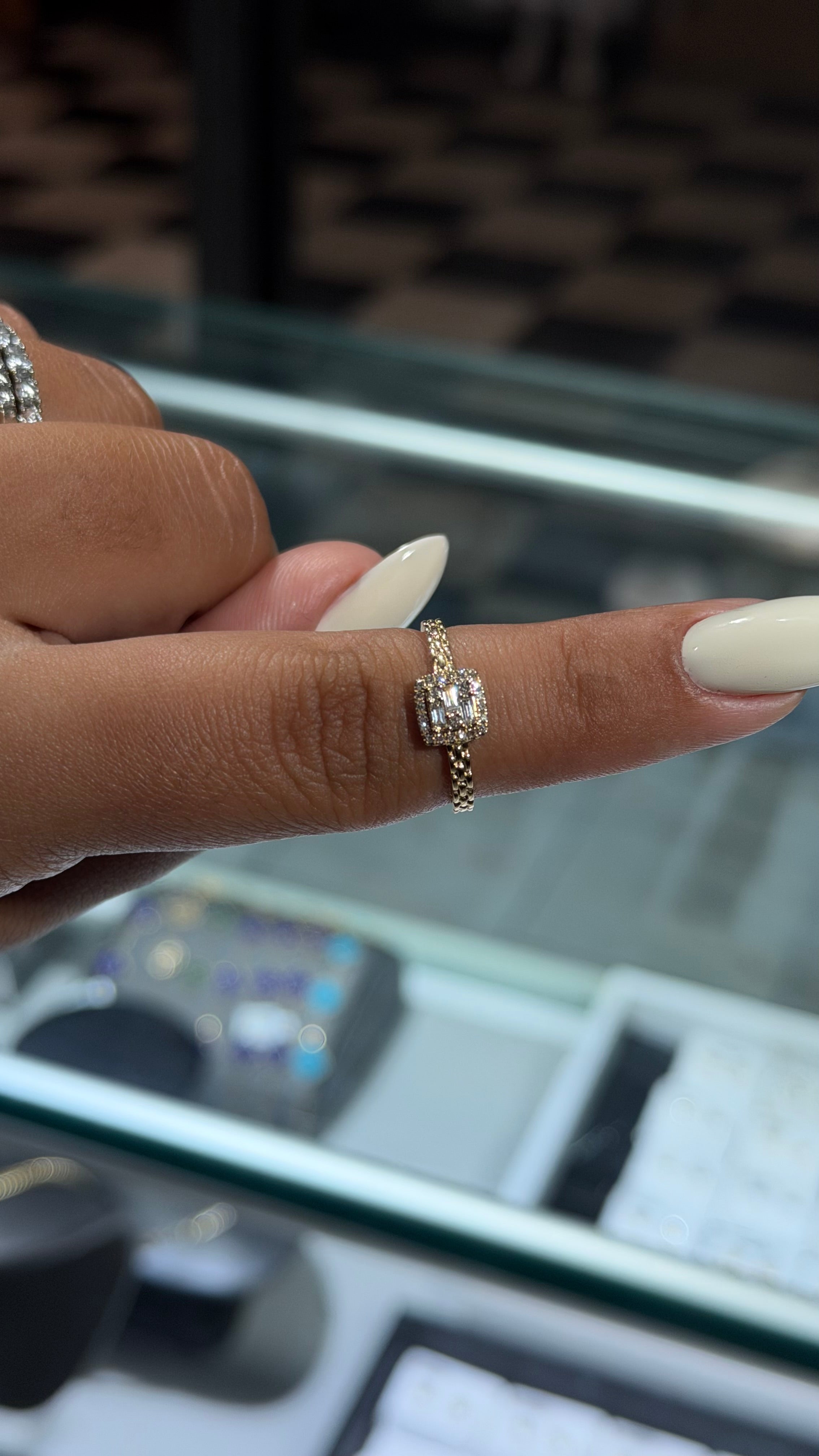 A refined and elegant design crafted in solid 14K gold, this ring features a stunning baguette-cut diamond center framed by a brilliant round-diamond halo. The band is accented with delicate diamond details, adding shimmer from every angle while keeping the look timeless and sophisticated.