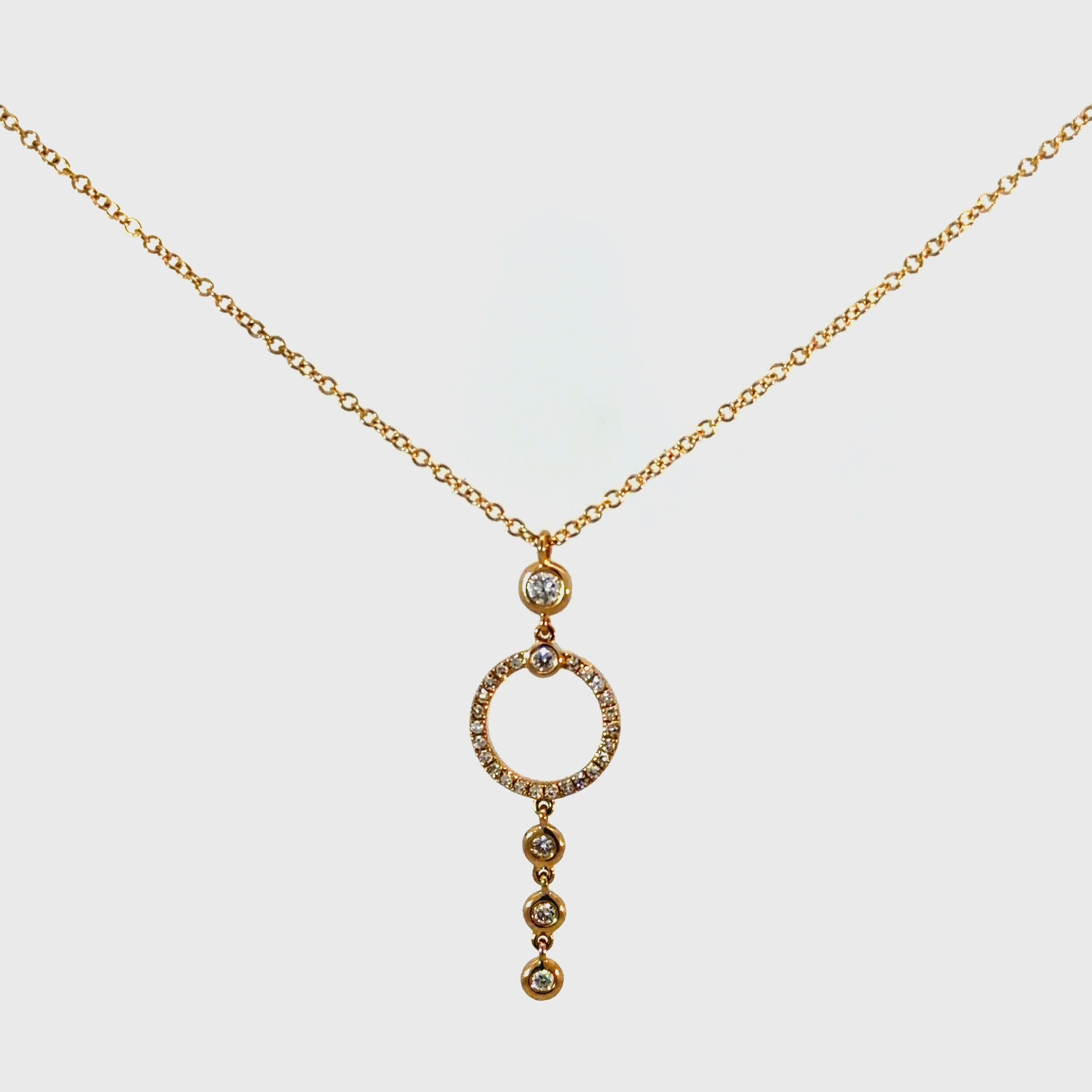 A high-end silhouette crafted in 14K gold, featuring a floating diamond circle with a cascading trail of brilliant natural diamonds.